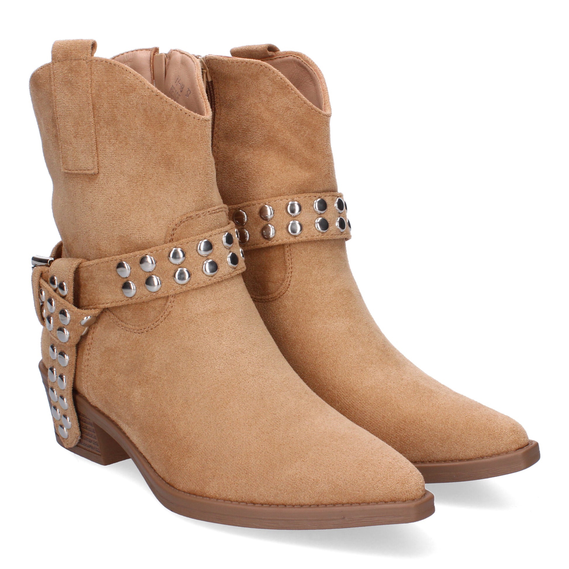 Botín de Tacón para Mujer Estilo Campero Comodas y Elegantes con Hebilla Decorativa y Tachuelas Diseño Moderno y Versátil.